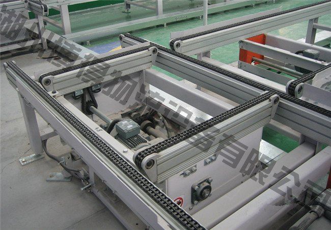 頂升移行機(jī),其結(jié)構(gòu)主要由滑撬、頂升框架、頂升連桿機(jī)構(gòu)、頂升電機(jī)、移行雙鏈、移行電機(jī)組成,滑撬放置在移行雙鏈上,移行雙鏈固定在頂升框架上,頂升電機(jī)通過頂升連桿機(jī)構(gòu)與頂升框架依次連接成一個(gè)整體,移行電機(jī)固定在移行雙鏈的一側(cè)。優(yōu)點(diǎn):具有較強(qiáng)的靈活性和互換性;用連桿機(jī)構(gòu)代替常用的鏈傳動(dòng)結(jié)構(gòu),使傳動(dòng)鏈更加簡潔,可有效提高傳動(dòng)效率、降低運(yùn)行噪音。頂升電機(jī)提供設(shè)備頂升的動(dòng)力,無需用氣。簡化車間管路和氣源點(diǎn)的布置;移行雙鏈起輸送滑撬的作用,它能夠?qū)⒒似椒€(wěn)移行到其它設(shè)備上;移行電機(jī)給移行雙鏈提供所需的動(dòng)力,以實(shí)現(xiàn)滑撬的移行過渡;可通過電氣檢測開關(guān)檢測轉(zhuǎn)臂的不同位置來實(shí)現(xiàn)頂升機(jī)構(gòu)的到位檢測,無需再安裝輔助的發(fā)號裝置。