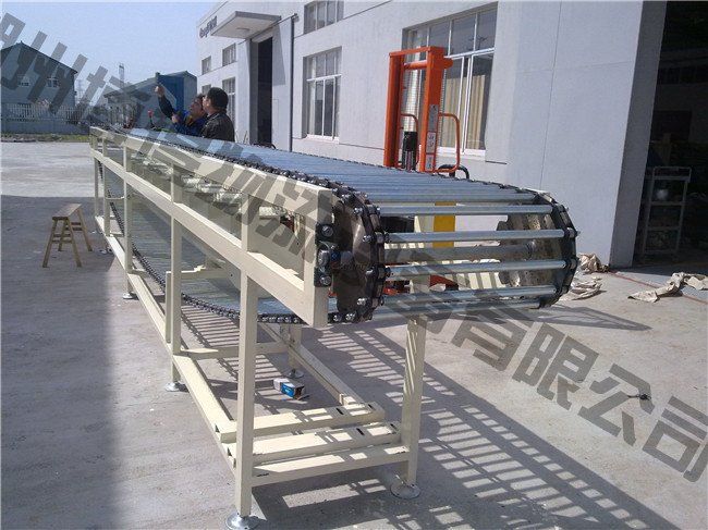 鏈條輸送機(jī)是以鏈條作為牽引和承載體輸送物料,鏈條可以采用普通的套筒滾子輸送鏈,也可采用其它各種特種鏈條(如積放鏈,倍速鏈)。鏈條輸送機(jī)的輸送能力大,主要輸送托盤、大型周轉(zhuǎn)箱等。輸送鏈條結(jié)構(gòu)形式多樣,并且有多種附件,易于實(shí)現(xiàn)積放輸送,可用做裝配生產(chǎn)線或作為物料的儲(chǔ)存輸送。標(biāo)準(zhǔn)輸送機(jī)寬度為 200、300、400、500、600、700、800、1000、1200、1500、2000mm等,也可按客戶需求采用其它特殊規(guī)格。
